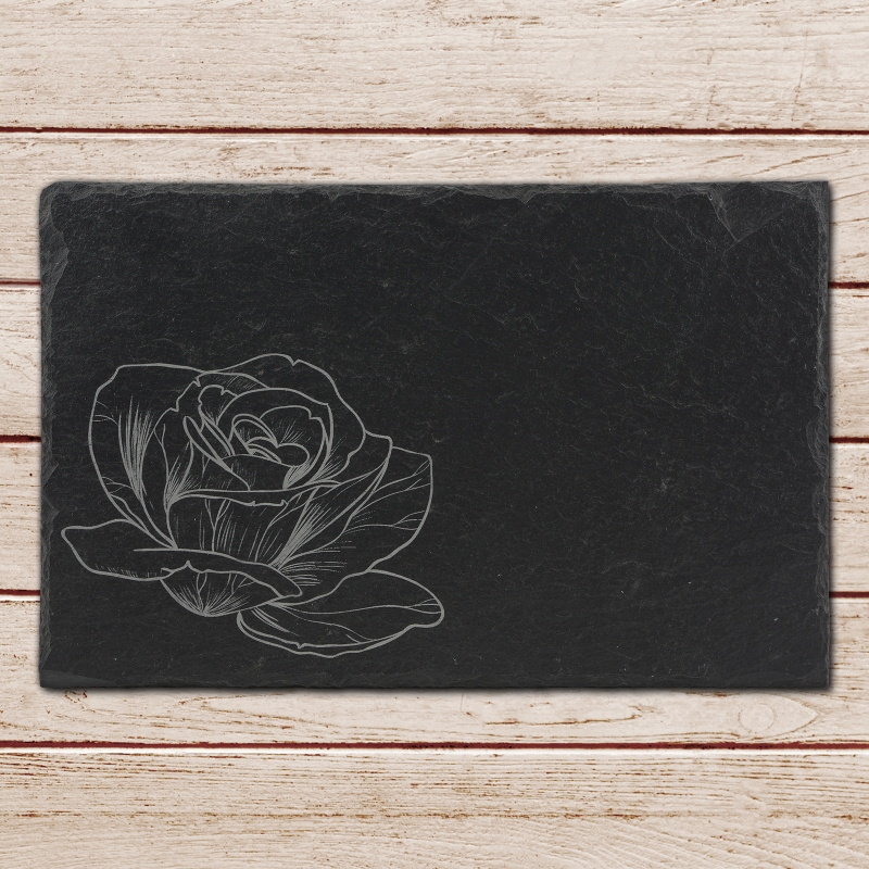 Unser Motiv "Rose" für deine Tischdeko graviert in eine 25x16cm Schieferplatte. Es ist etwa 12x16cm an ungravierter Fläche vorhanden um z.B. eine Kerze darauf zu stellen.