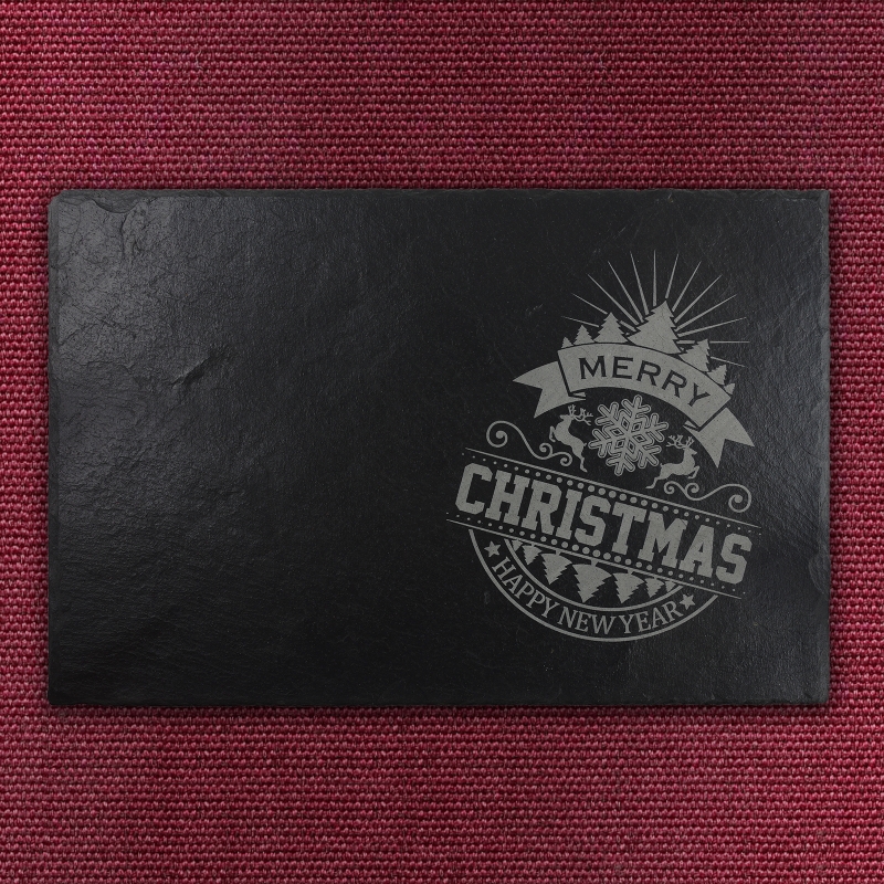 Unser Motiv "Merry Christmas Happy New Year" für deine Tischdeko graviert in eine 30x20cm Schieferplatte. Es ist etwa 15x20cm an ungravierter Fläche vorhanden um z.B. eine Kerze darauf zu stellen.